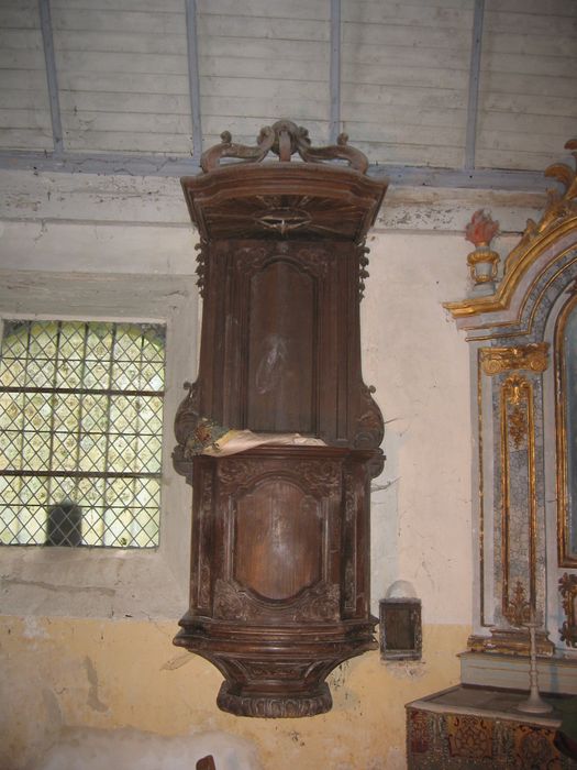 Cuve carrée aux angles chanfreinés et ornés de rinceaux. Les trois pans sont ornés d'une moulure symétriques de style Louis XIV encadrée aux angles de rinceaux et motifs rocaille. Culot mouluré, orné de godrons et terminé par une grappe de raisin encadrée de pampres. Porte à charnières. Dorsal orné au centre d'une moulure symétrique et dans les angles supérieurs de rinceaux. Le dorsal est cantonné en partie inférieure de deux ailerons à volutes et en partie supérieure de deux chutes de fleurs. Abat-voix orné de la colombe du Saint Esprit en gloire. Couronnement composé de six volutes.
