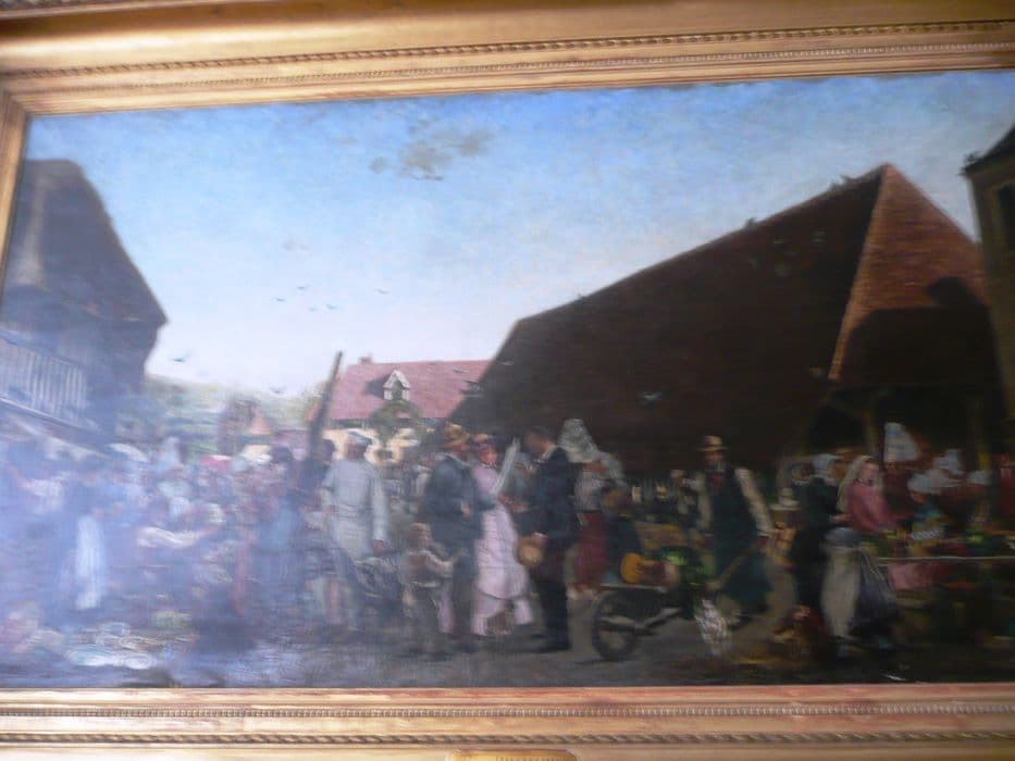 Au premier plan sont les personnages animant le marché : vendeurs ou acheteurs, en costume d'époque. A l'arrière plan sont les halles de Dives-sur-Mer sur la droite de la scène, et sur la gauche une maison à colombage.