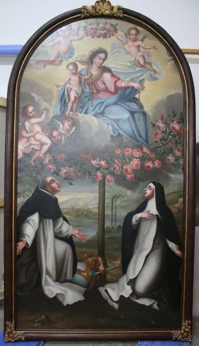 tableau et son cadre : Donation du rosaire à sainte Catherine de Sienne et à saint Dominique