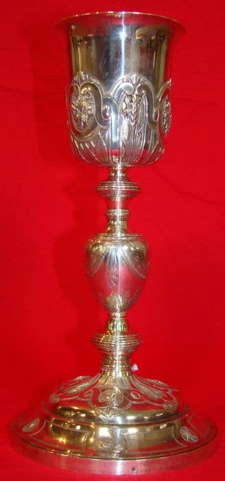 Pied circulaire. Cavet orné de fleurs séparées par des réserves rectangulaires. Terrasse plate, à décor de cartouches entrelacés : circulaires (accueillant des coquilles) et allongés (accueillant pampres, épis de blé et une croix) en alternance. Tige en balustre. Viroles basse et haute moulurée. Noeud central ovoïde, à décor de festons de draperie ciselés. Fausse coupe ajourée. Même décor que sur le pied : les cartouches circulaires abritent des pampres, les cartouches allongés abritent des épis de blé. Coupe sans décor.