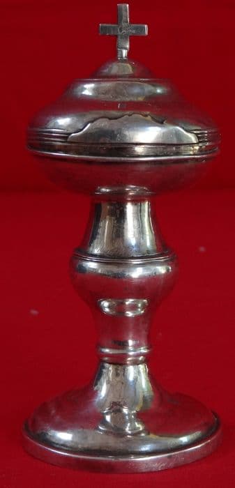 Pied circulaire, tige renflée, noeud se dévissant pour accueillir une ampoule aux saintes huiles, large coupe, couvercle galbé à charnières, croix sommitale. Sous le pied, cavité fermant par un couvercle à charnières.