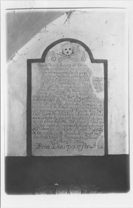 Epitaphe (gravée) : (...) Repose le corps de Vener (...) - persone Mr Marin (...) - cette paroisse le quel a (...) - petuité au refor de cette église (...) 4 aoust 1664 – Pries Dieu pour son Ame.
