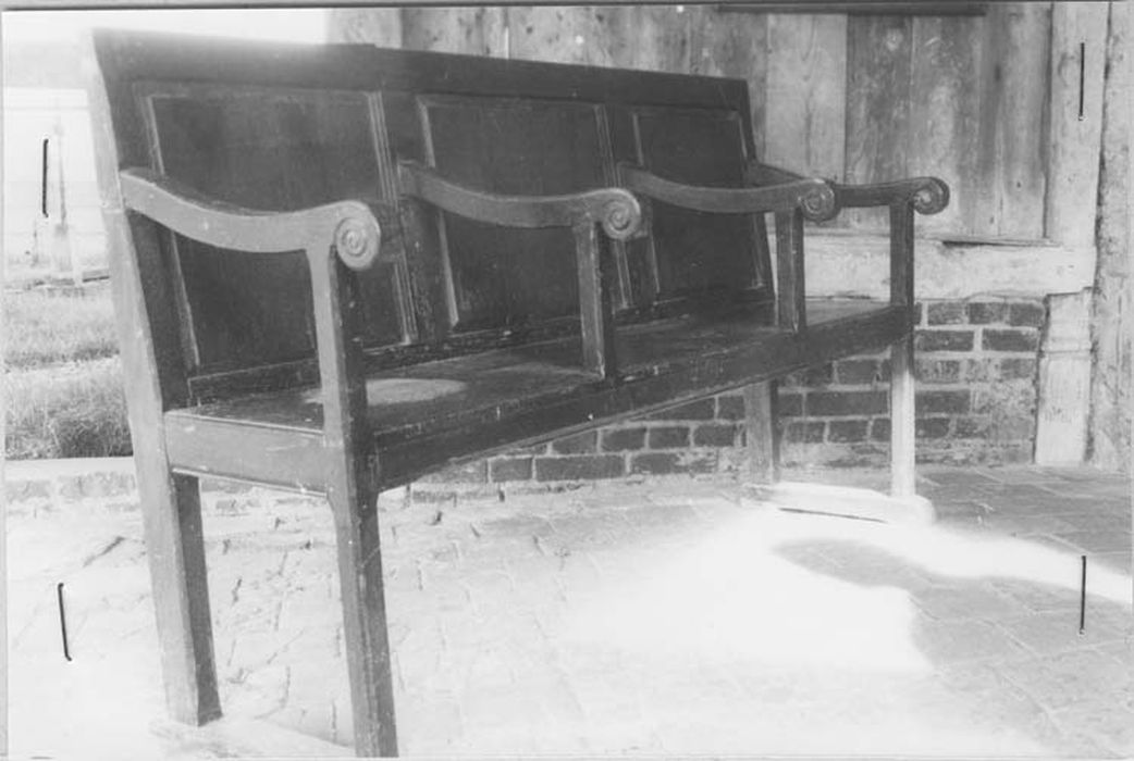Ce banc repose sur quatre pieds de section carrée reliés (antérieur et postérieur) par des traverses basses. Assise faite d'un assemblage de planches. Deux accotoirs aux extrémités, et deux aux centre, délimitant ainsi trois places assises. Les consoles d'accotoir sont droites, de section carrée, celles des extrémités prolongeant le pied antérieur. Les bras d'accotoir sont galbés et terminés en arrondi. Dossier rectangulaire, orné de trois panneaux rectangulaires moulurés.