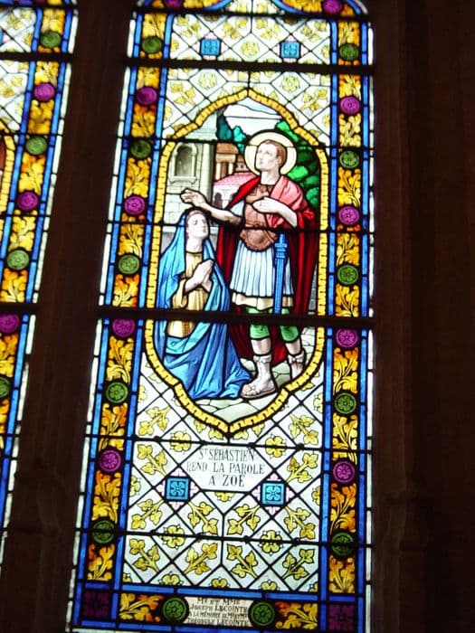 deux verrières n°3 : Saint Polycarpe baptise les convertis par saint Sébastien et Saint Sébastien rend la parole à Zoé.