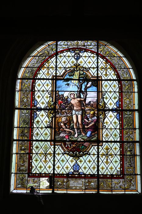 Verrière rectangulaire et cintrée. Sur fond de vitrerie losangée incolore ornée de petites croix et de fleurs de lys jaunes, représentation dans un médaillon rectangulaire dont les petits côtés sont en cintre décroché. Frise de chapelets en bordure et large encadrement à décor Renaissance (candélabres, rinceaux, masques, griffons, cornes d'abondance).
