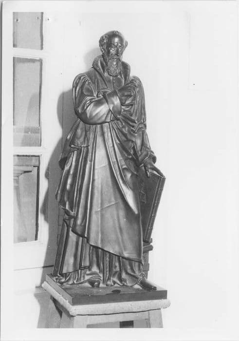 Statue d'un législateur debout, tenant un livre avec le symbole de la justice (balance) sur la couverture. Il tient le rôle d'un procès dans la main droite (?).