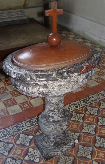 Fonts baptismaux en marbre noir veiné formés d'un socle carré, d'un pied à balustre de section ovale, forme d'urne en son centre, et d'une cuve ovale, avec bordure en tore. Elle est percée de deux cuvettes circulaires et de deux cavités. Couvercle en chêne (ou orme ?), ovale, légèrement bombé, sommé d'une croix fichée sur une sphère.