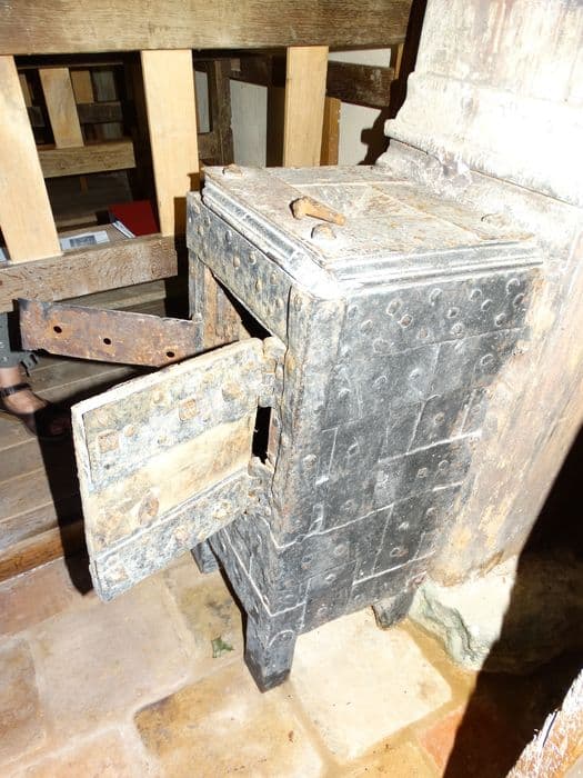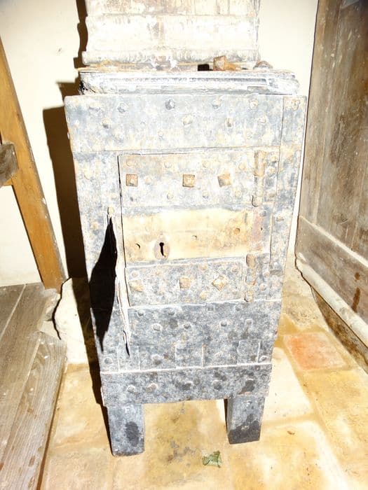 Tronc de quête. Tronc vertical à plan carré, sur quatre pieds. Faces recouvertes de plaques de fer cloutées.