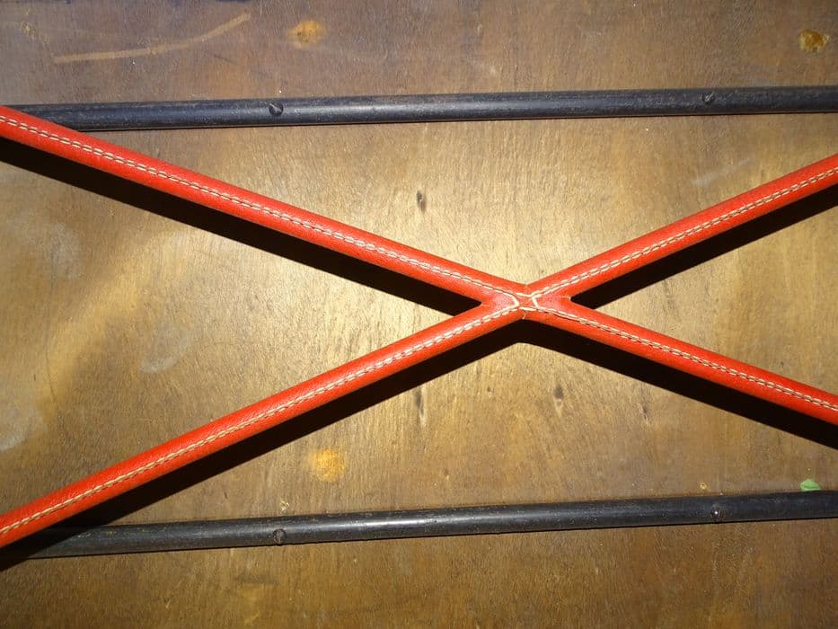 deux tables en sanglar rouge et surpiüres blanches (mobilier. non affecté à des pièces)
