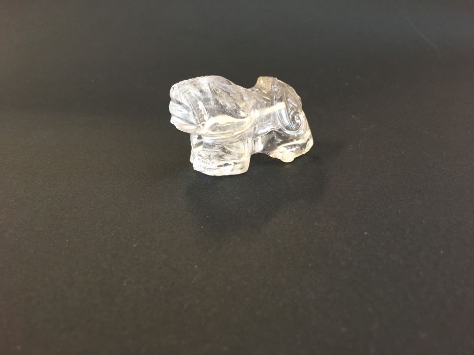 Taillé dans un seul morceau de crital de roche, ce lion minuscule, pattes repliées, queue retroussée, tête relevée, témoigne de tout l'art du bestiaire musulman. Présence d'une petite cavité cylindrique forée entre les pattes du lion.