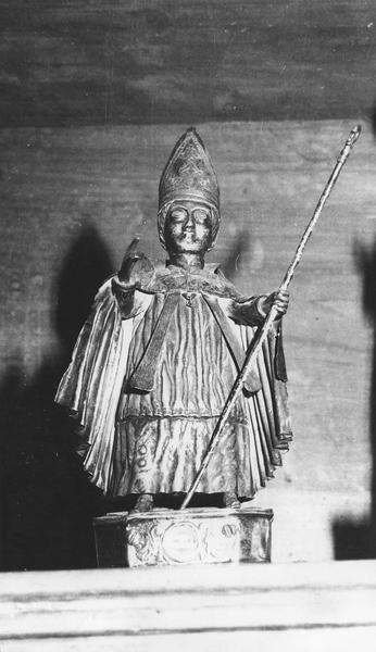 Saint représenté debout sur un socle octogonal où sont enfermées les reliques.