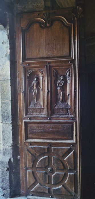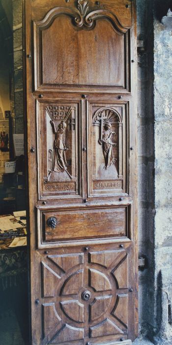 La tradition voulait que ces bas-reliefs aient été réutilisés dans la réalisation d'une nouvelle porte au 18e siècle. Si la comparaison stylistique avec les stalles conservées dans l'église est envisageable, l'observation plus approfondie lors de la restauration de 2013 a permis de démentir cette option. En effet, les dimensions de chaque panneau semble trop ajustées pour être seulement le fruit d'une bonne adaptation.
