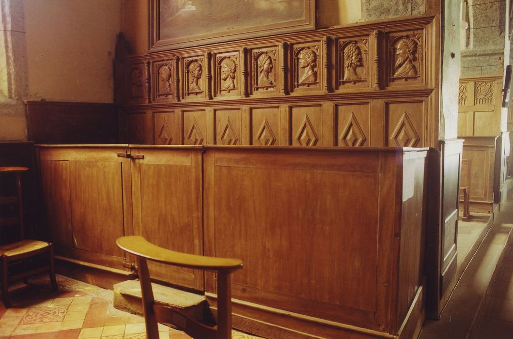 Le banc d'oeuvre est constitué d'une estrade en chêne, d'un prie-Dieu et d'un banc, c'est dans la partie supérieure du dossier que les bas-reliefs ont été rémployés.