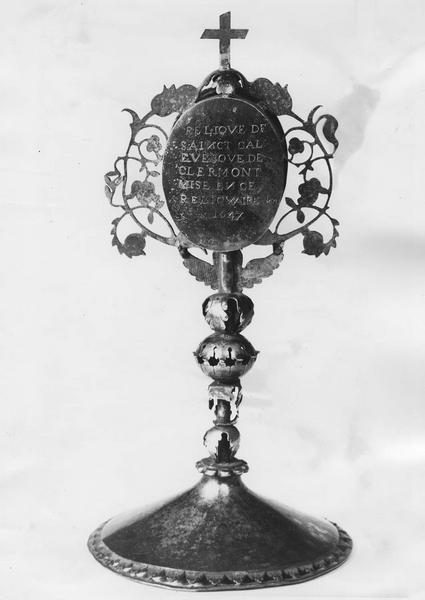 inscription : RELIQUE de SAINCT GAL EVESQUE de CLERMONT MIS EN CE RELIQUAIRE EN 1647 (au dos). Date : 1647 (au dos).