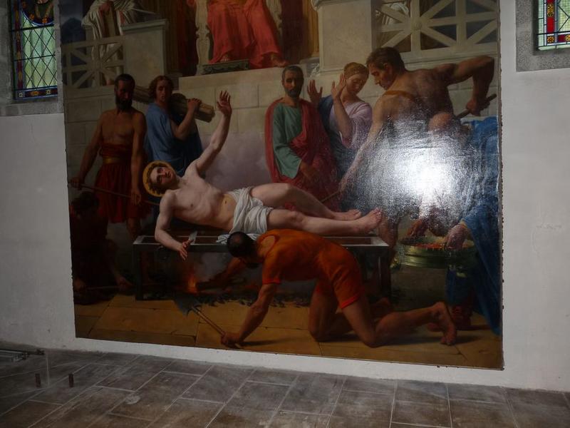 La toile de Saint-Mamet représente le moment précis du supplice où les bourreaux s'activent autour du saint auréolé et étendu à demi-nu sur un grill, sous les regards des Romains.