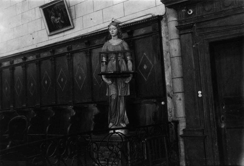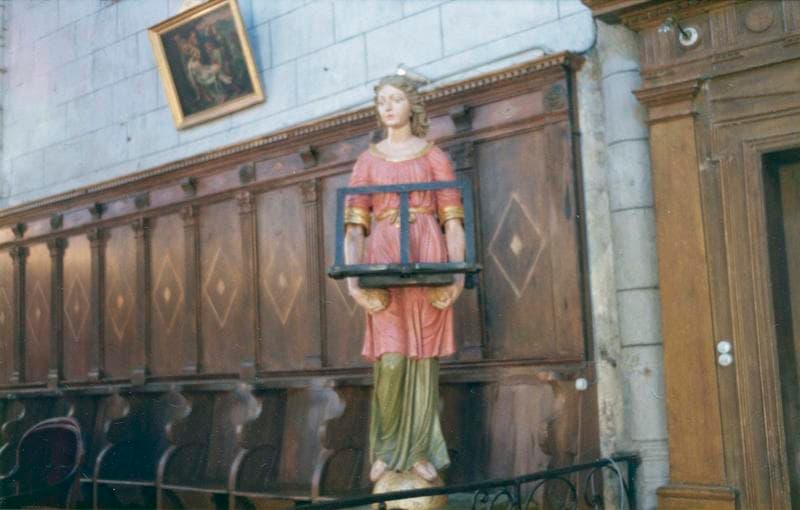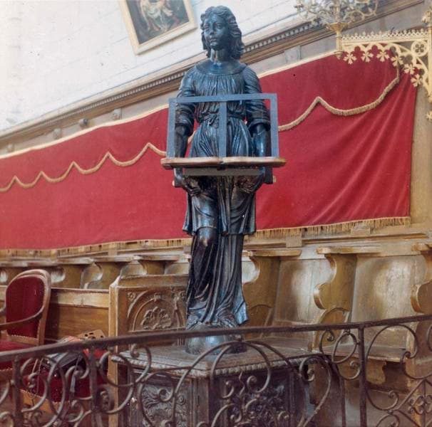 Formé par la statue d'un ange, en pied, dont les mains pendantes supportent le pupitre. Un second pupitre est fixé sur son dos.