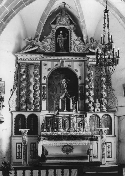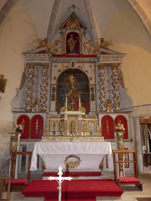 Au-dessus du tombeau de l'autel, le tabernacle semi-hexagonal vient en saillie par rapport aux deux panneaux rectilignes qui le prolongent s'achevant en S renversés. L'ensemble est divisé par des colonnes torses en cinq éléments contenant une niche garnie d'une statuette polychrome et couronné par une balustrade. Au-dessus du tabernacle, un petit baldaquin surmonté d'un Christ de la Résurrection. Au registre suivant, deux grandes colonnes torses avec chapiteaux corinthiens encadrent une toile : le Christ en croix entre la Vierge et Saint Jean-Baptiste, partiellement cachée par un élément rapporté. Deux S renversés viennent en retour aux extrémités. Au-dessus de la corniche, qui comporte deux amorces de fronton triangulaire, une grande niche, prise entre deux colonnes torses dorées, prolongées sur les côtés par deux S renversés, contient une statue de Saint Jean-Baptiste polychrome. Elle est surmontée d'un fronton triangulaire occupé par Dieu le père en bois doré, pris à mi-corps, les bras écartés. Deux consoles en gaines, avec décor polychrome, étaient destinées à recevoir les deux bustes-reliquaires polychromes, un évêque et un saint, placés actuellement entre les colonnes torses et faisant partie intégralement de cet ensemble.