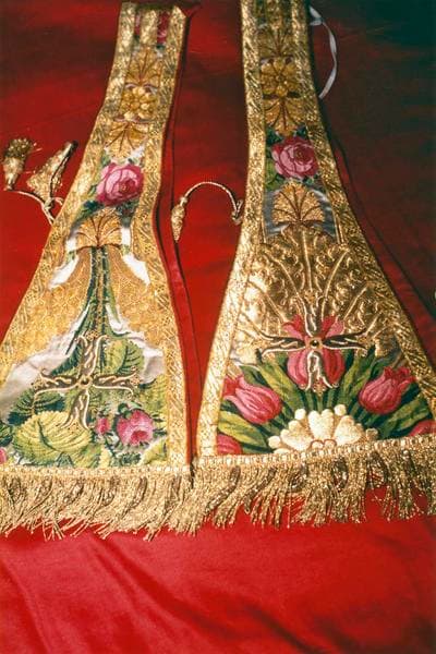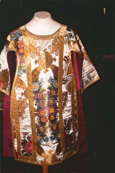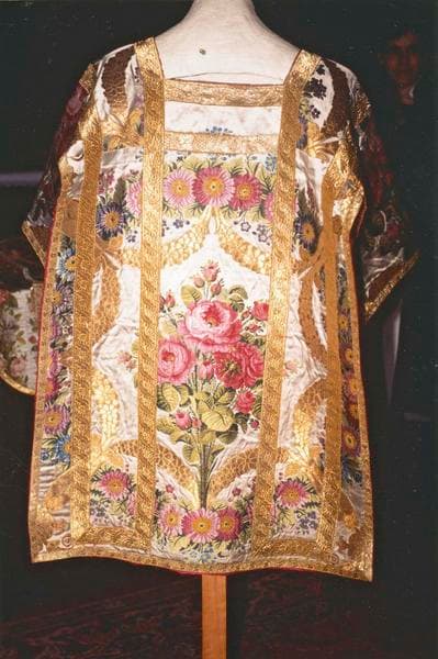 7 chapes, 5 chasubles, 8 dalmatiques, 4 voiles de calice, 6 étoles, 7 manipules, 5 bourses, voile huméral (ornement dit ornement du roi)