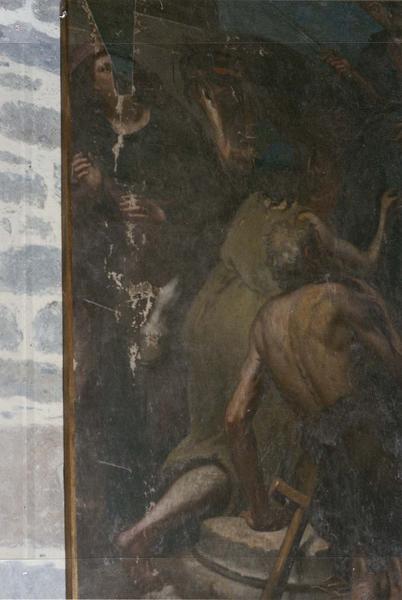 Nombreux décollements entre la toile et son support en bois. Nombreuses restaurations apparentes dont une abusive et hasardeus effectuée à une époque indéterminée, soulèvements de la couche picturale. Décollements.