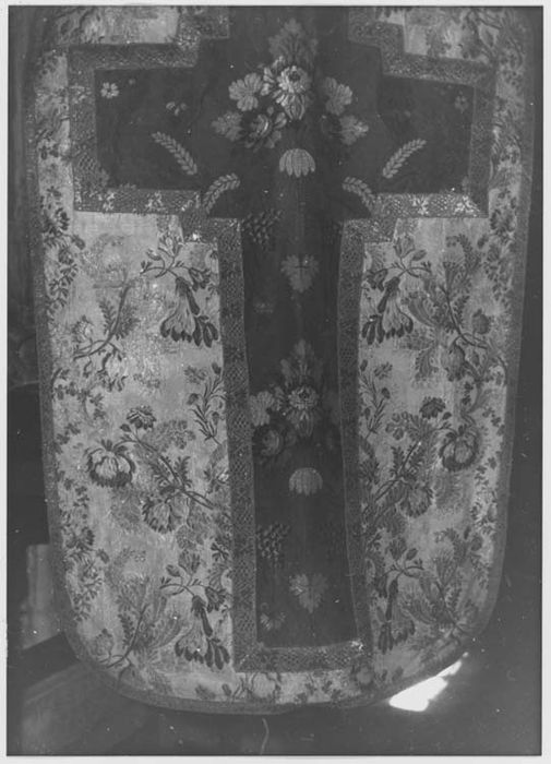 Soierie rose à décor fleuri vert. La croix dorsale de la chasuble est dessinée par un large galon d'or. Un galon plus étroit borde le vêtement qui est doublé de grosse toile.