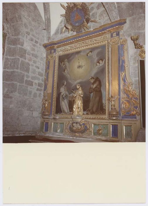 Triangle trinitaire ; gloire : rayons lumineux ; ange : tête ; ordre ionique ; feuille d'acanthe ; Coeur Sacré de Jésus ; Coeur Sacré de Marie ; saint François d'Assise ; sainte Elisabeth de Hongrie ; livre ; saint Antoine de Padoue : lys