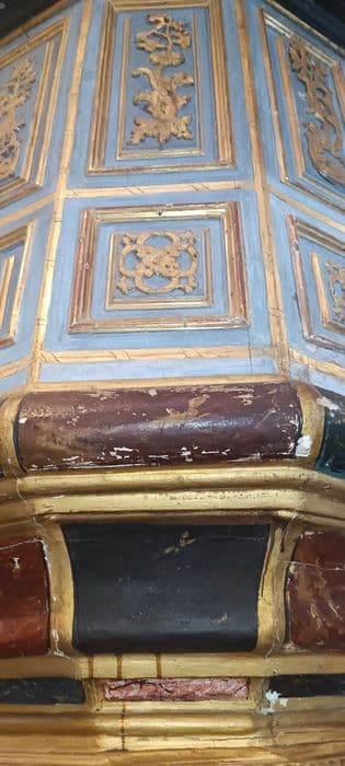 La cuve comporte plusieurs panneaux moulurés, divisés en deux caissons : caisson supérieur rectangulaire et caisson inférieur carré, décorés respectivement de feuillages stylisés et de motifs géométriques ; on accède à la cuve par un escalier à panneaux simplement moulurés.