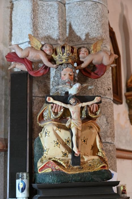 Dieu le Père est représenté en vieillard barbu, aux cheveux longs, vêtu d'une robe décorée d'étoiles, tenant du bout des doigts la croix où est crucifié le Christ, surmontée d'un Saint Esprit. Au-dessus deux angelots tiennent une couronne fermée surmontée d'une croix.