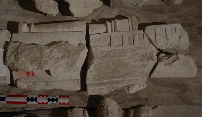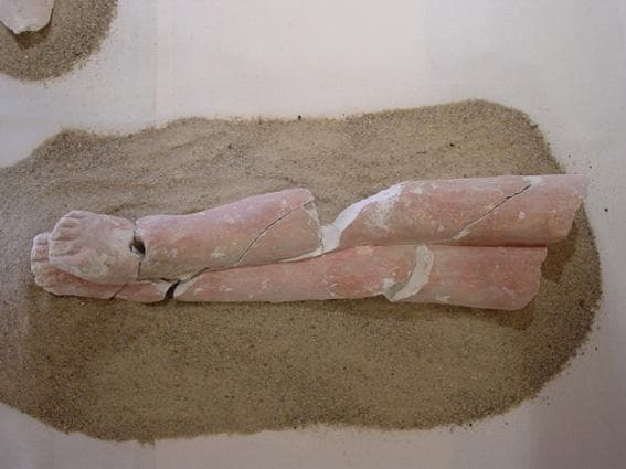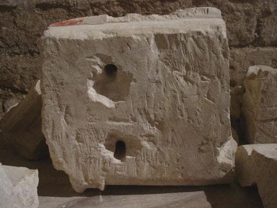 Pierre calcaire polychrome (traces de couleurs verte, rouge et rose chair), vestiges du mortier de scellement au dos.