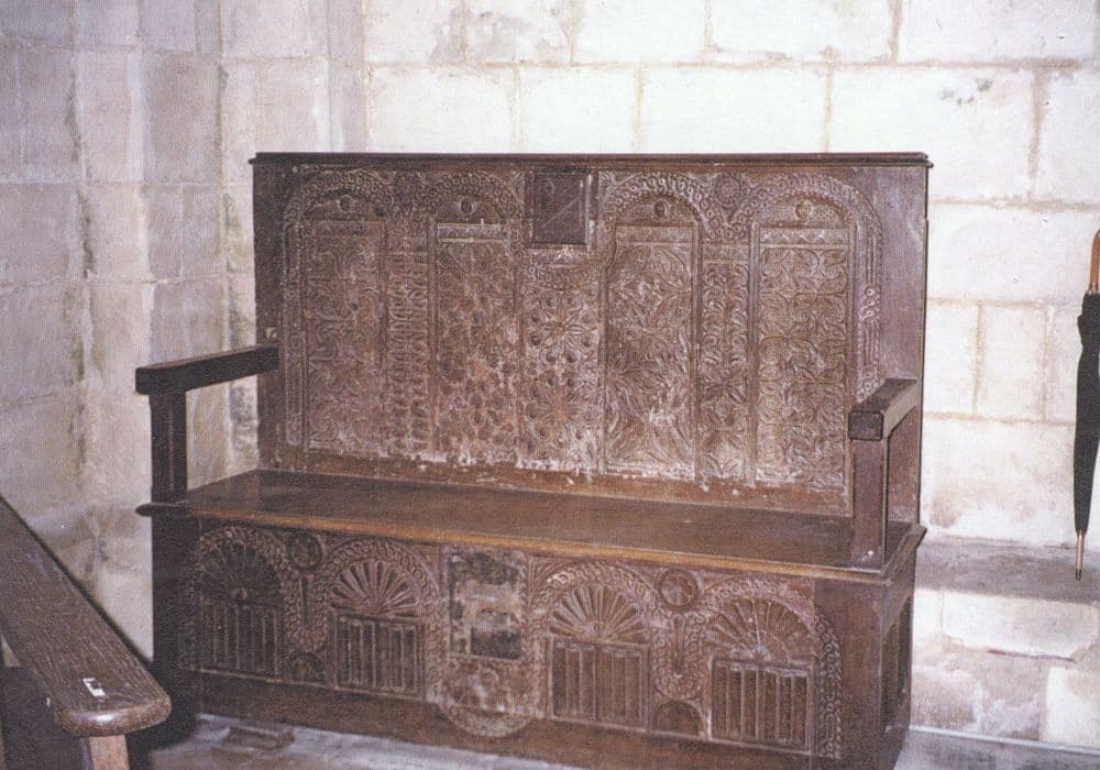 Un blason est sculpté sur le banc, au centre. Grande finesse de la sculpture. Très beaux motifs sur le dossier et sur le banc en référence au gothique flamboyant.