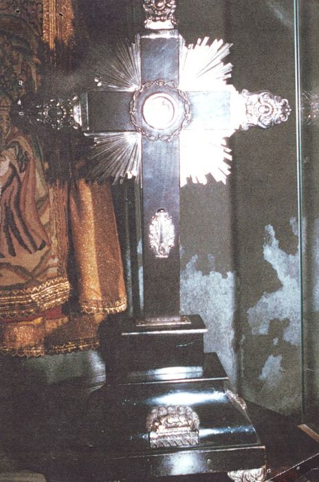 Croix reliquaire contenant une relique de la Sainte-Croix. Socle en ébène avec appliques de chaque côté : agneau, coeur de jésus, coeur de Marie. A l'intérieur du socle se trouvent deux attestations des reliques de la Sainte Croix : de Monseigneur Cousseau (1813) et du diocèse de Poitiers (1933).