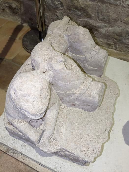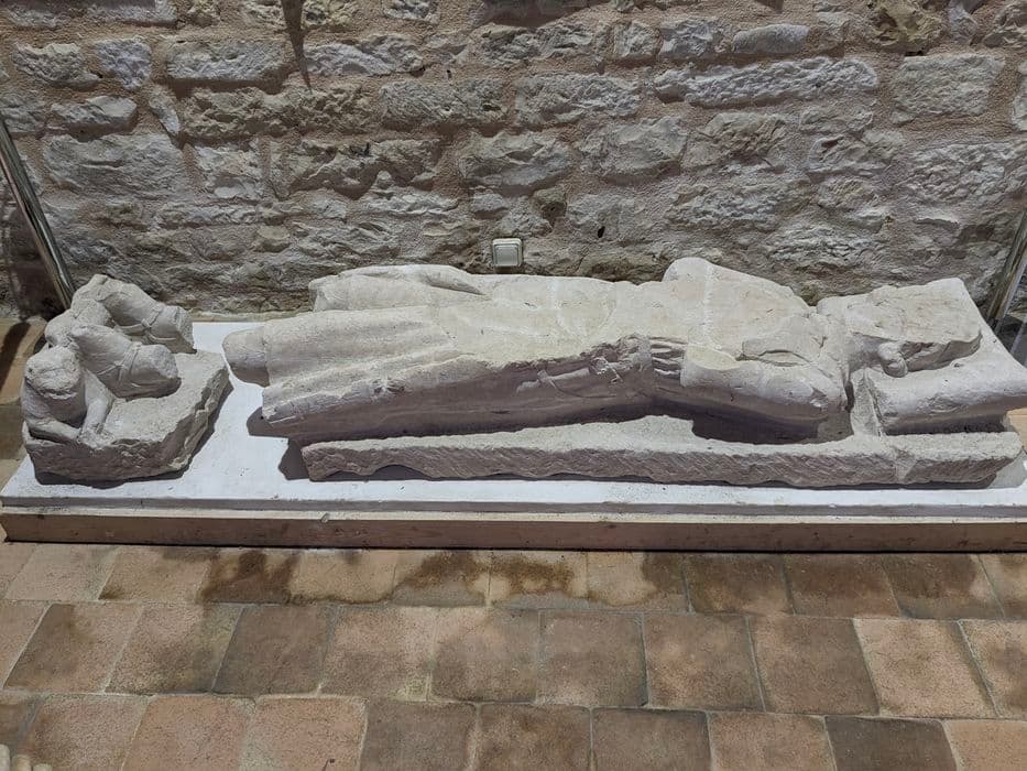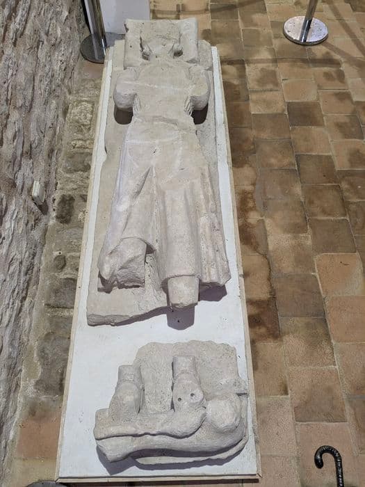 Gisant représentant un chevalier allongé avec les pieds reposant sur un lion, le tout sur une dalle monolithe.