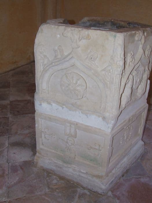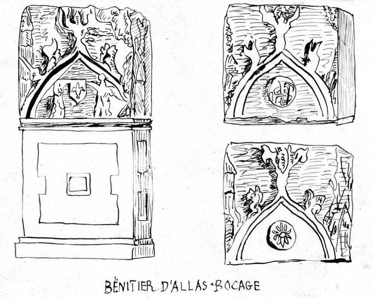 Trois côtés du bénitier seulement sont ornés.