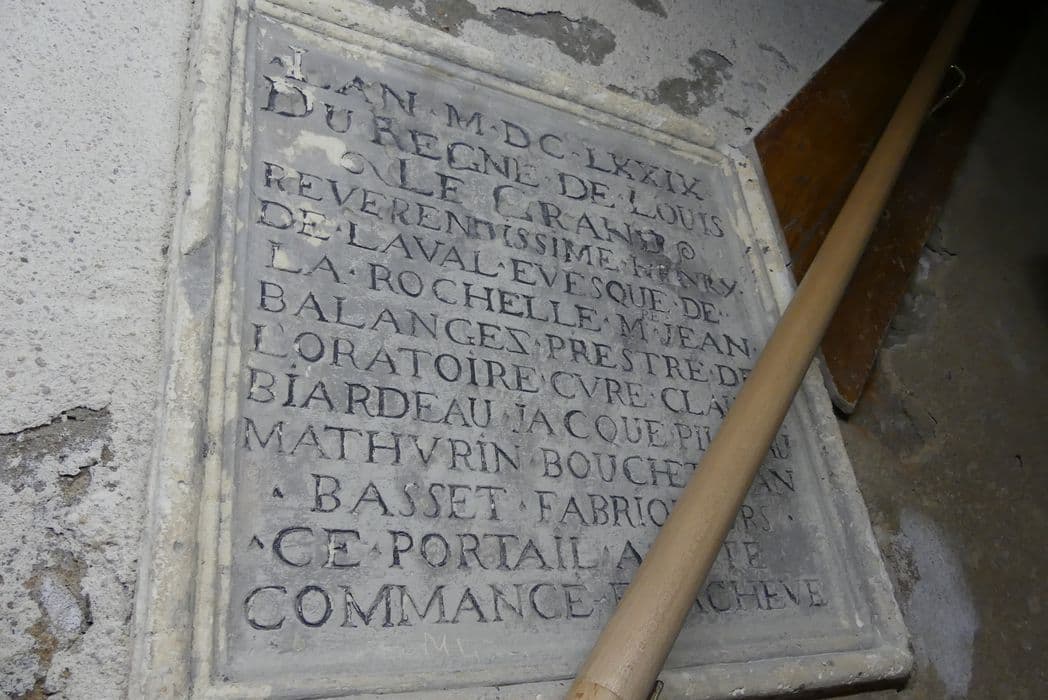 transcription : L'AN MDCLXXIX DU REGNE DE LOUIS LE GRAND REVERENDISSIME HENRY DE LAVAL EVESQUE DE LA ROCHELLE MRE JEAN BALANGES PRESTRE DE LORATOIRE CURE CLAUDE BIARDEAU JACQUES PILLEAU MATHURIN BOUCHET JEAN BASSET FABRIQUEURS CE PORTAIL A ESTE COMMANCE ET ACHEVE