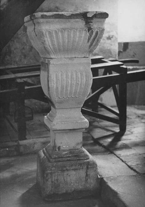 Bénitier taillé dans plusieurs blocs formant deux registres évasés vers le haut et bombés, à motifs de cannelures, sur un piédouche lui-même posé sur un socle.