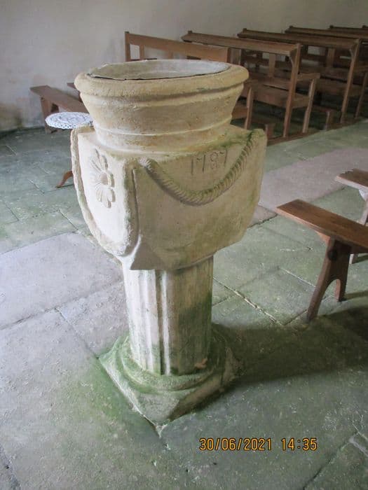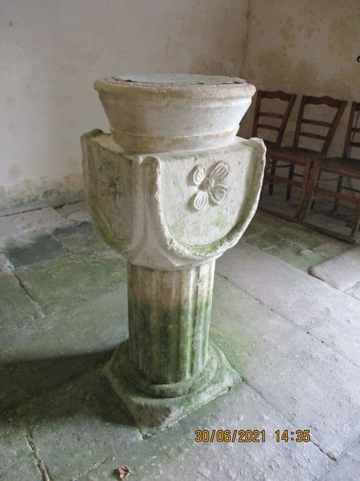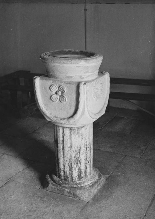 Bénitier composé d'une cuve posée sur un tronçon de colonne cannelée, et formée de deux registres : la cuve à proprement parler (de section ronde) et une bague de section carrée l'entourant, dont chaque côté est orné d'une petite fleur.
