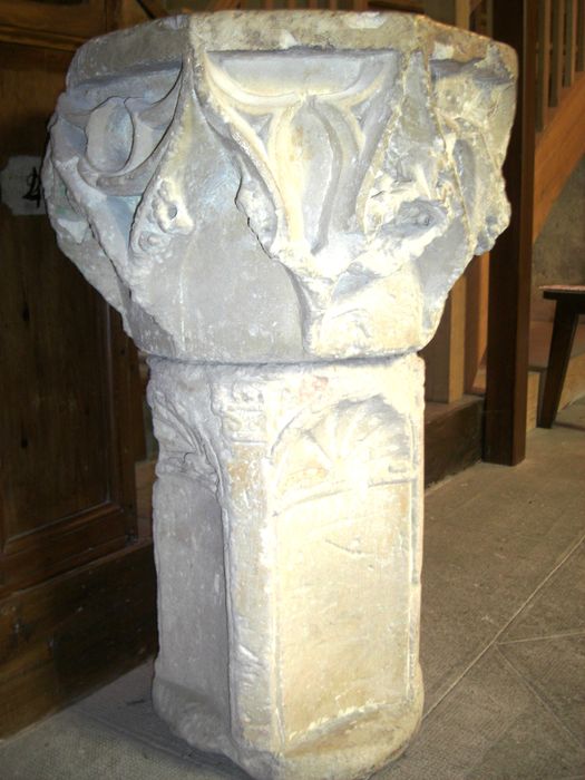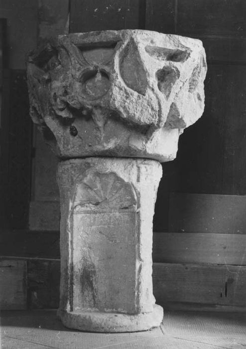 Bénitier en deux fragments : le registre inférieur, cylindrique, comporte une niche surmontée d'une coquille ; le registre supérieur est décoré de motifs géométriques.
