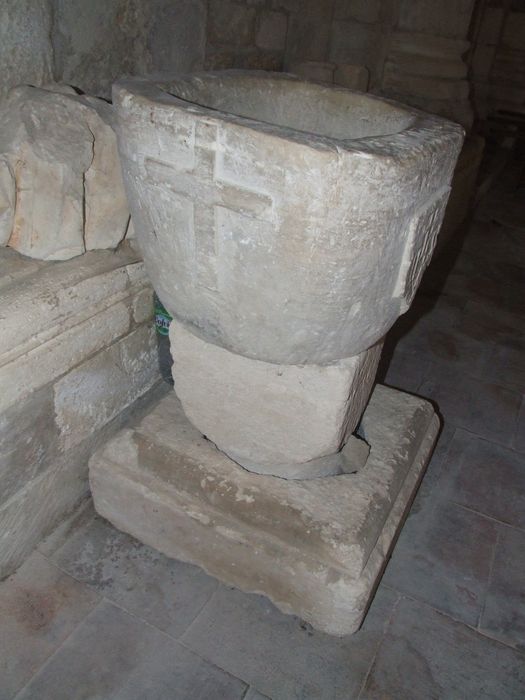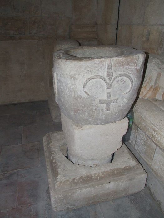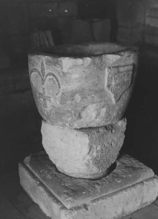Fonts baptismaux ornés d'une fleur de lys, d'une croix et d'un écusson portant une inscription.