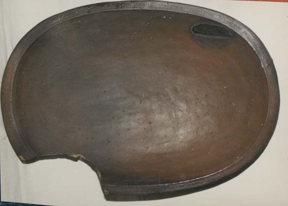 Bénitier en pierre à pied cannelé avec sa vasque en terre cuite portant une inscription.