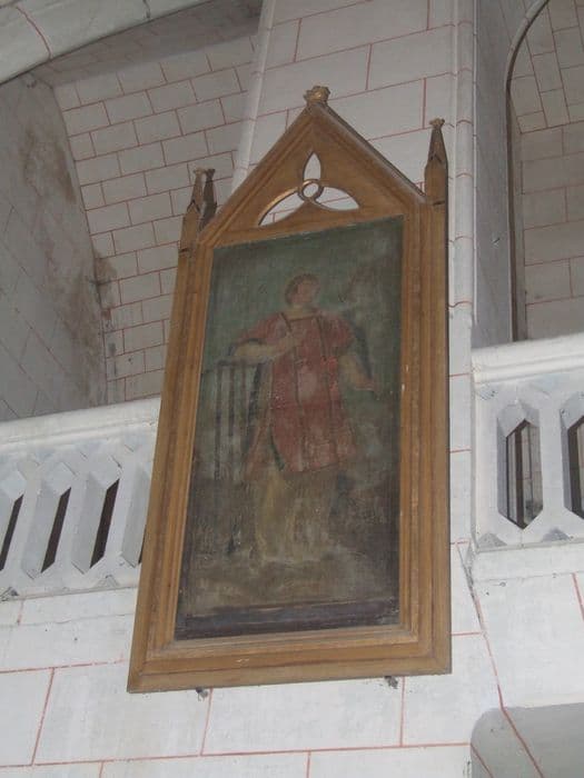 Panneau en bois dans un cadre en bois sculpté d'inspiration néogothique à formes géométriques sobres (fronton triangulaire, pinacles de part et d'autre).