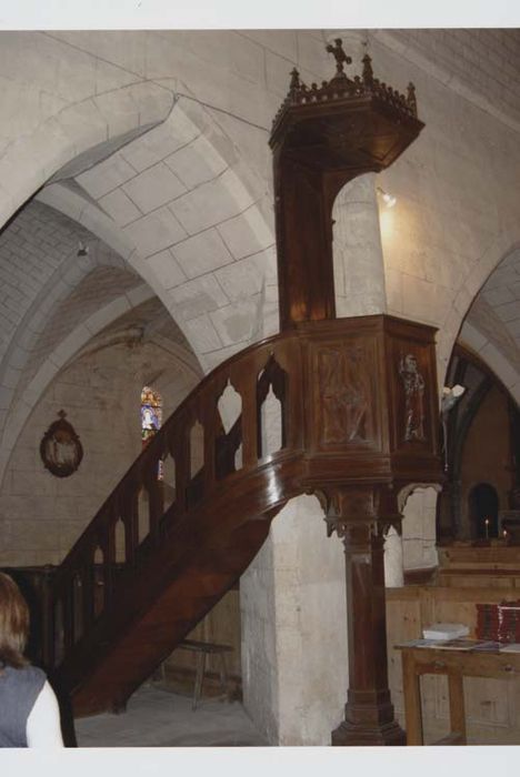 Chaire à décor néogothique simple reposant sur une colonne à fût hexagonal. Sur un des trois panneaux est figuré un saint Pierre. La chaire est complète.