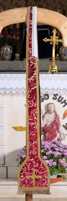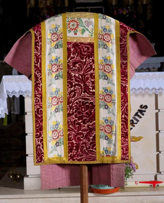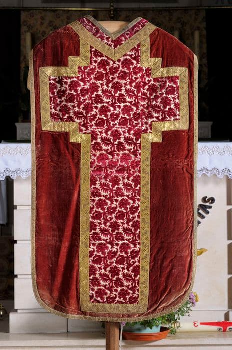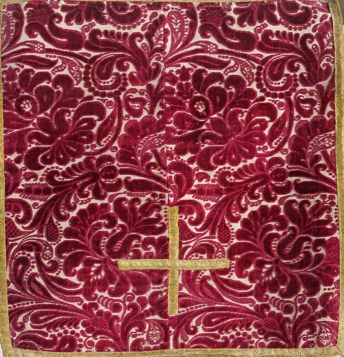 Ensemble d'une chasuble et d'une dalmatique en velours de soie rouge, à réserves formées par un velours à motifs végétaux rouges sur fond blanc, délimitées par des galons de fils d'or. La seconde dalmatique présente un assemblage de bandes de velours à motifs végétaux rouges sur fond et blanc et de bandes de soie brochée à bouquets de fleurs colorés sur fond blanc. Les bandes de tissu sont également bordées de galons de fils d'or. L'étole, la manipule, la bourse de corporal et le voile de calice sont confectionnés dans du velours ciselé à motifs végétaux rouges sur fond blanc et sont bordés de galons dorés.
