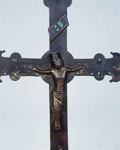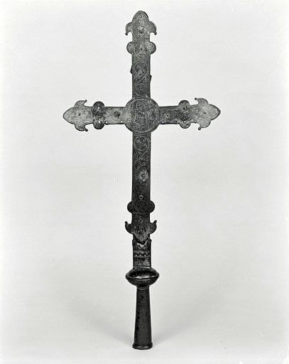 La croix florencée à croisée circulaire, le noeud et le départ du montant sont soudés entre eux ; 3 figures d'applique fondues sont rivetées sur l'avers ; seul le titulus est émaillé ; le bas du montant est fixé à un manchon plat soudé à un noeud au sommet d'une douille