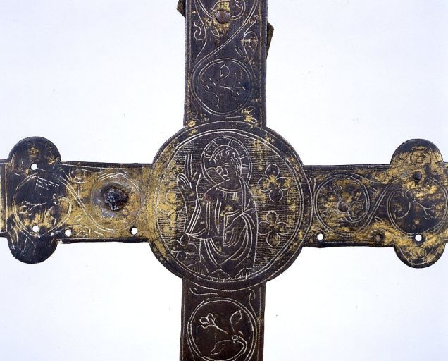 A l'avers, le Christ en croix rapporté au centre de la Croix est couronné, 2 autres figures rapportées subsistent en haut et en bas du montant (saints non identifiés, celui du haut mutilé), les fleurons des bras sont gravés d'un rinceau végétal enroulé sur lui-même ; le revers porte à la croisée un médaillon gravé sur lequel figure le Christ bénissant sur fond strié orné de quatre-feuilles, le montant et la traverse sont parcourus d'un fin rinceau à larges enroulements et petits fleurons, les symboles des Evangélistes sont gravés à leurs extrémités.