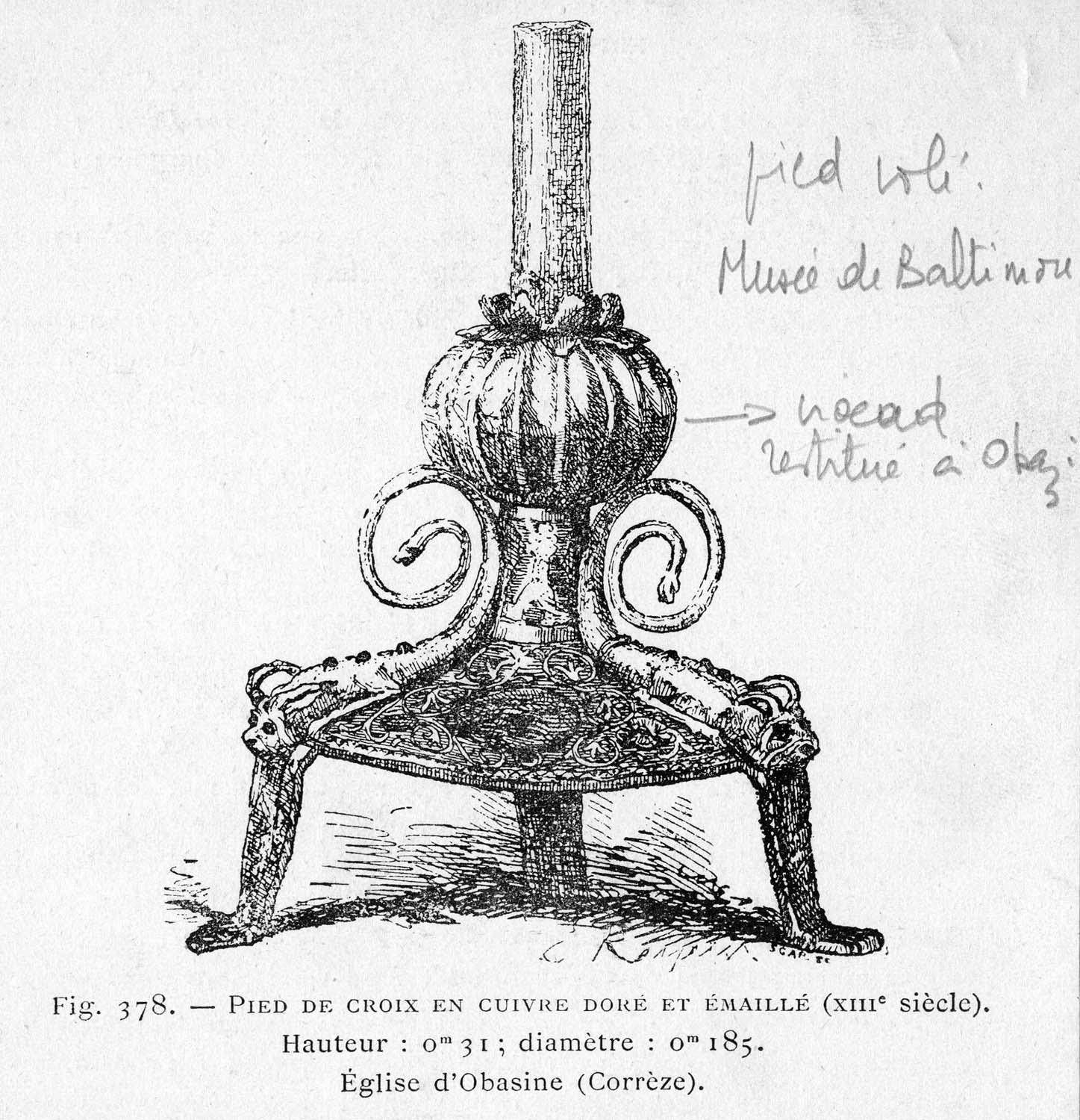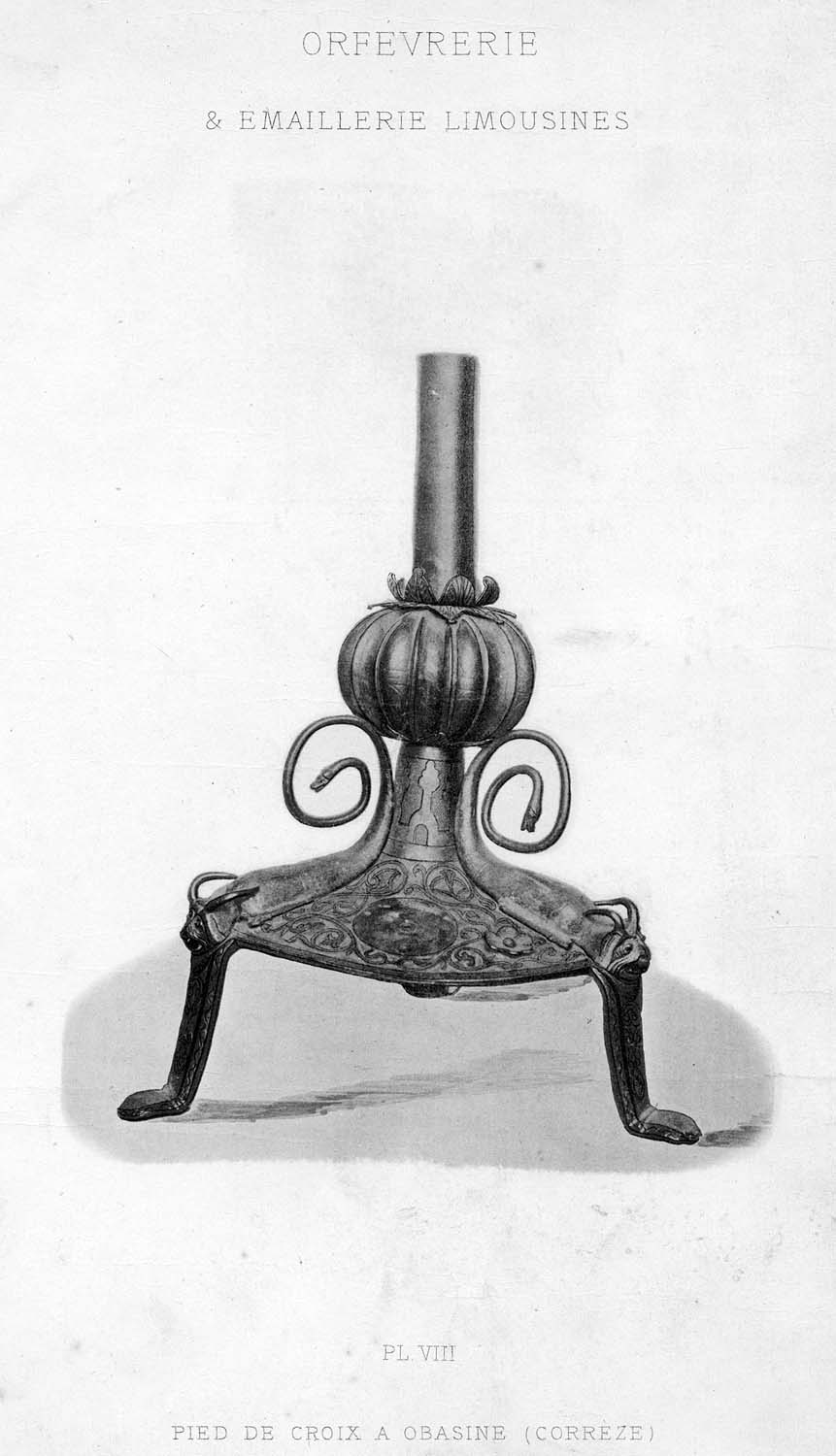 Le pied de croix est circulaire, il est émaillé ; trois dragons en cuivre sont rapportés, des rosettes ainsi que des médaillons ont disparu ; trois pattes de cuivre supportent le pied qui s'élève en cône ; un noeud est enfoncé le long du cône ; sur ce noeud circulaire sont rivetées trois collerettes en cuivre