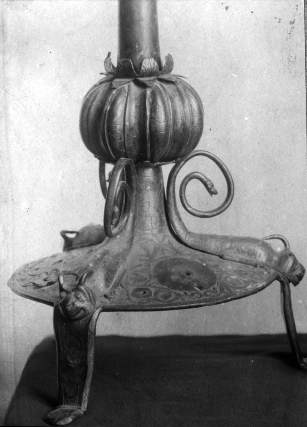 La partie émaillée du pied représente des rinceaux ; les dragons cornus et couchés se prolongent en enroulements terminés par une tête animale ; les pattes à griffe sont décorées de rinceaux ; le noeud voit alterner huit godrons et autant de canaux, les premiers figurent une feuille lancéolée, les seconds sont décorés de bandes obliques ; le noeud est enserré entre deux collerettes composées chacune de huit feuilles d'eau ; l'une d'elles est doublée par une autre collerette de même décor mais aux feuilles repliées.