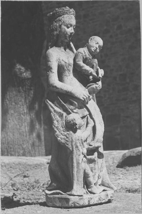 La Vierge couronnée est déhanchée, elle porte l'Enfant Jésus à sa gauche ; il incline la tête qui ne porte qu'une couronne de cheveux ; il est vêtu d'une tunique et tient une colombe dans sa main droite ; aux pieds de la Vierge, à gauche, figure un petit ange qui regarde l'Enfant et soutient de la main gauche le phylactère que présente la Vierge ; la gamme chromatique est restreinte : vert pour les vêtements et jaune pour les chevelures, les lèvres de la Vierge sont peintes en rouge.