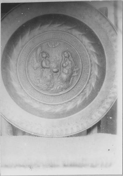Au centre du plat, l'ombilic est décoré de l'Annonciation : l'archange est à gauche, il tient un sceptre terminé en fleur de lys, la Vierge à droite est assise, un livre est ouvert sur ses genoux, dans la partie supérieure est représentée la colombe du Saint-Esprit ; autour de l'ombilic court une inscription en caractères gothiques estampés doublée d'une rangée de feuilles ; une autre rangée de feuilles court sur le marli qui est bordé d'un motif figurant une fleur de lys entre deux grains.
