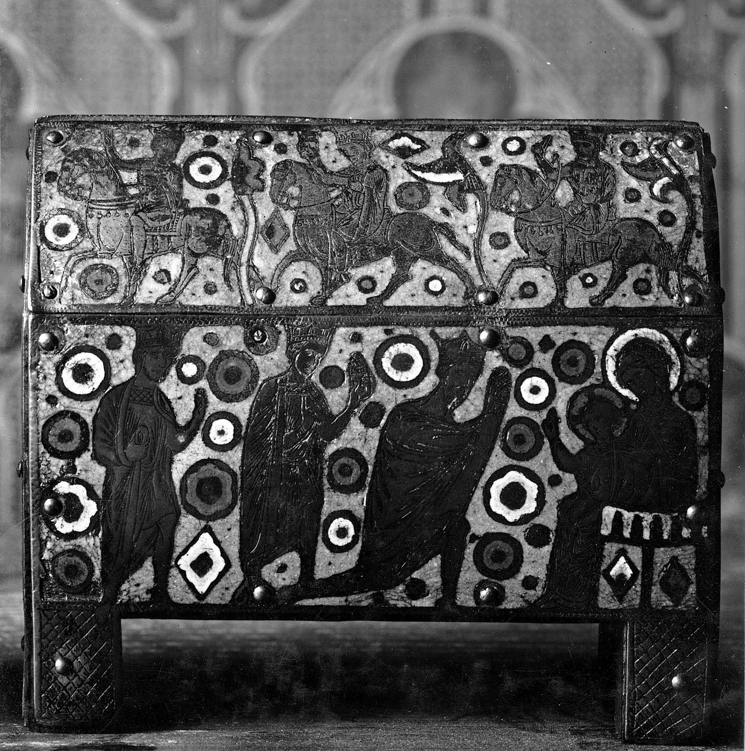 A l'avers, la plaque du toit figure la chevauchée des mages, sur celle de la caisse les mages se présentent à l'Enfant Jésus qui les bénit, assis sur les genoux de sa mère ; les figures sont traitées en réserve sur fond d'émail bleu abondamment semé de rosettes et de losange ; sur chacun des pignons un apôtre tenant un livre s'inscrit en pied dans une mandorle ; le revers est décoré d'un motif répétitif de quatre-feuilles disposés en damier.