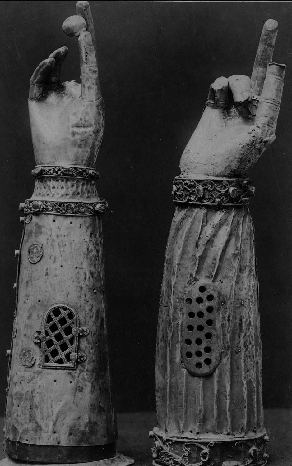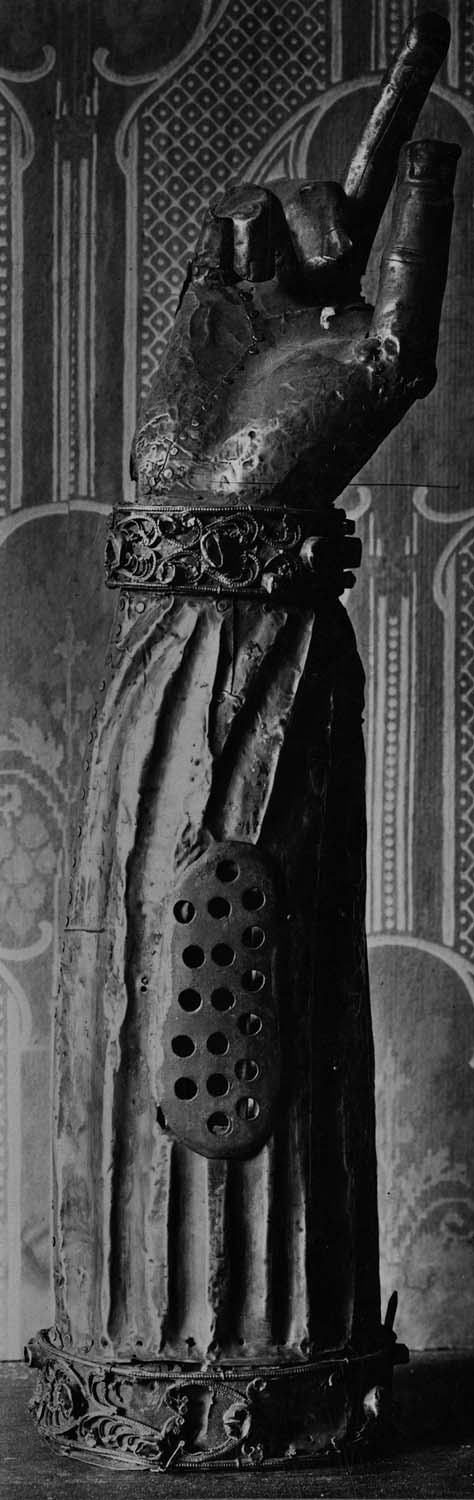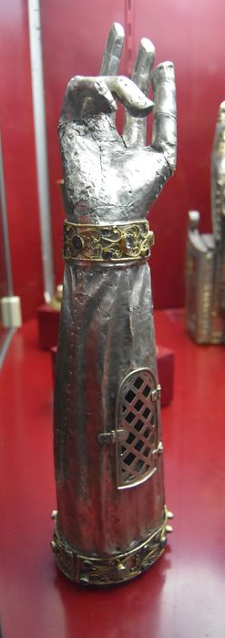L'âme de bois est recouverte de feuilles d'argent non dorées ; la manche est bordée à ses extrémités d'une bande d'argent filigrané doré comportant des cabochons montés à bâte (plusieurs séquences où 4 petits cabochons cantonnent un plus important) ; à l'avers, au centre du bras est ménagée une porte cintrée, fixée par deux charnières à droite et une à gauche