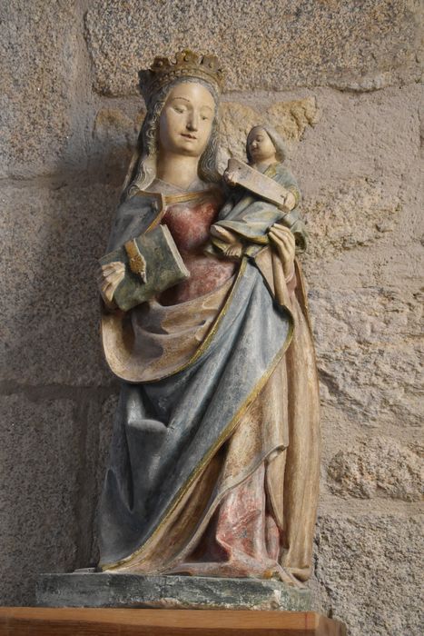 La terrasse est peinte en vert ; la Vierge déhanchée est vêtue d'une robe rouge et d'un manteau bleu à bords et revers jaunes ; sur ses cheveux bruns ondulés repose une couronne à fleurons ; de la main droite elle tient un livre fermé à fermoir jaune ; l'Enfant sur son bras gauche porte une tunique bleue, il tient un phylactère entre ses mains.